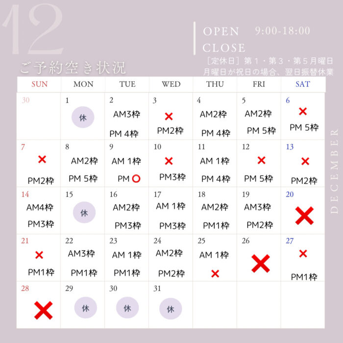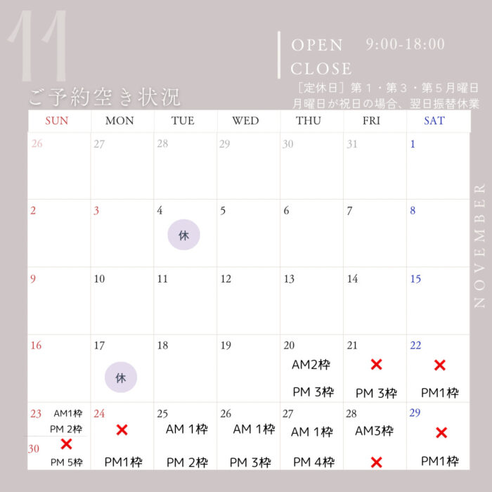 ※予約がいっぱいになっていなくてもコースによっては入れない事もございますので予めご了承下さい