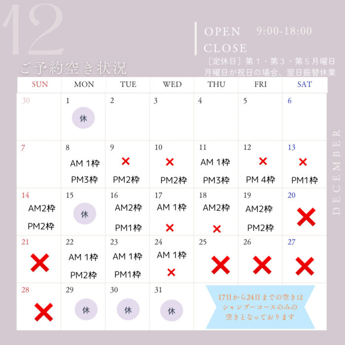 ※予約がいっぱいになっていなくてもコースによっては入れない事もございますので予めご了承下さい